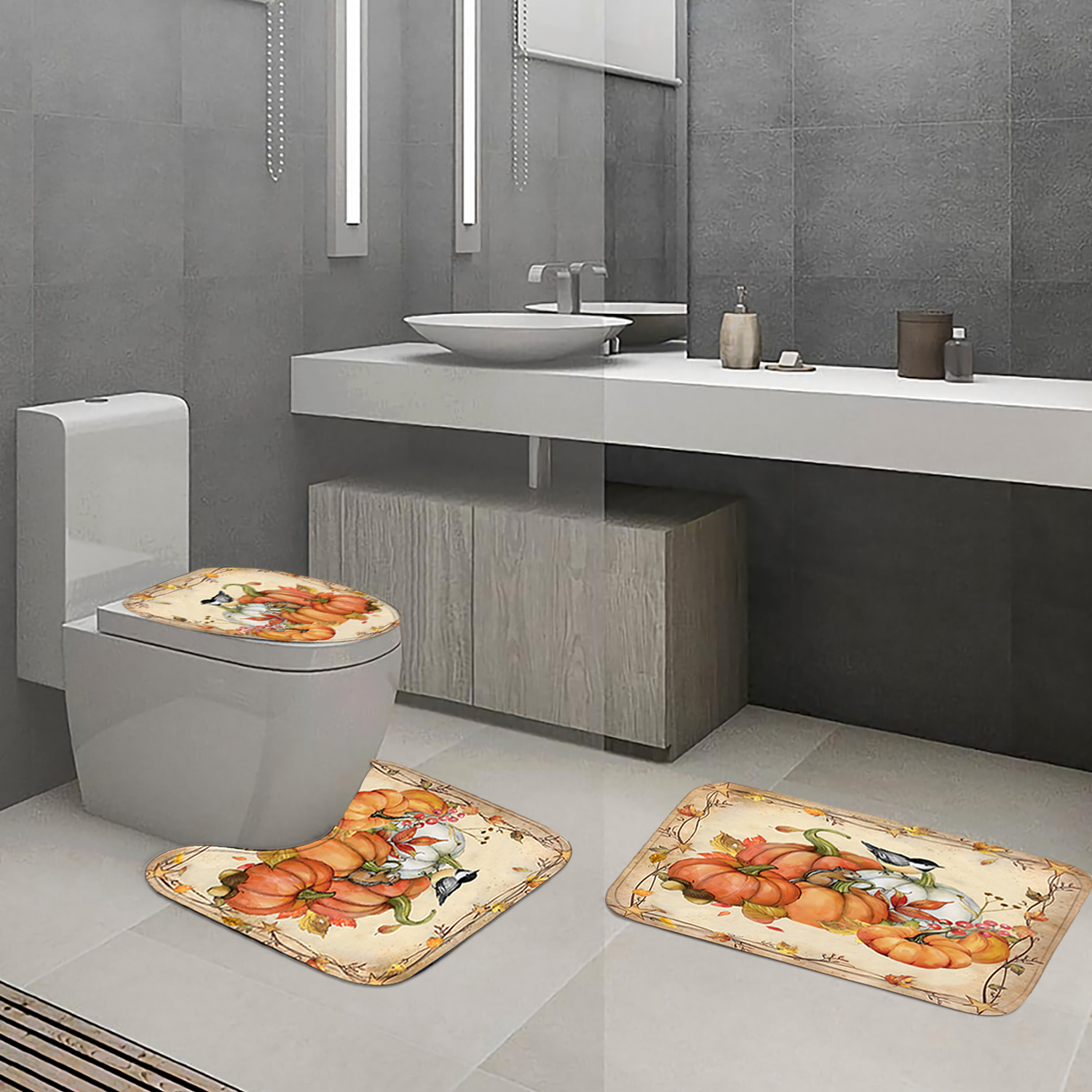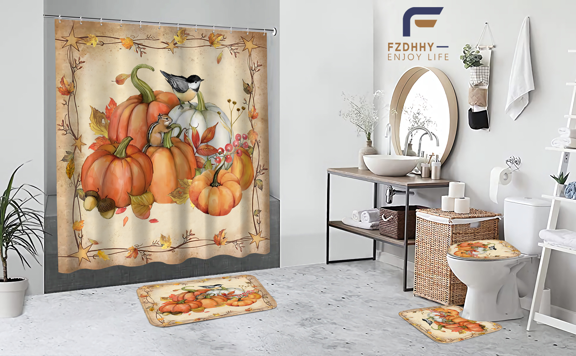 Fall Pumpkin Shower Curtain Bathroom Set Thanksgiving Shower Curtain SetPackage Includes: 1*shower curtain + 1*bath mat/carpet+1*Toilet lid+1*U-shaped carpet+12*Hooks